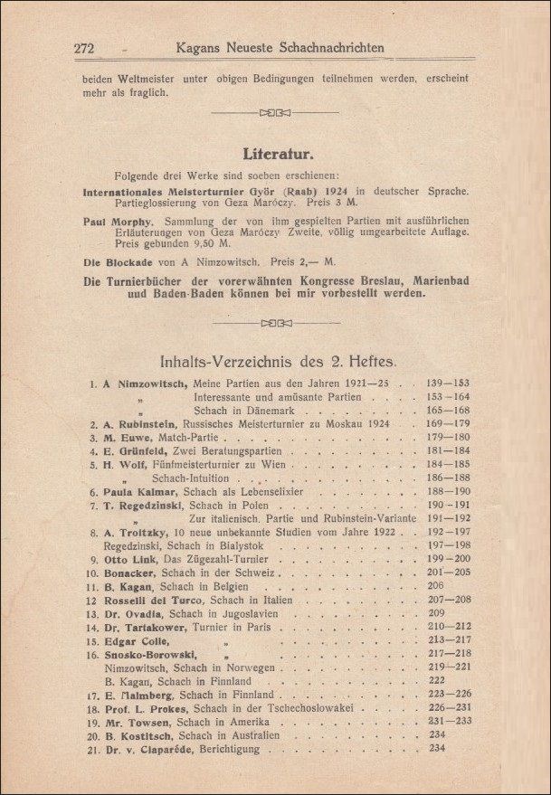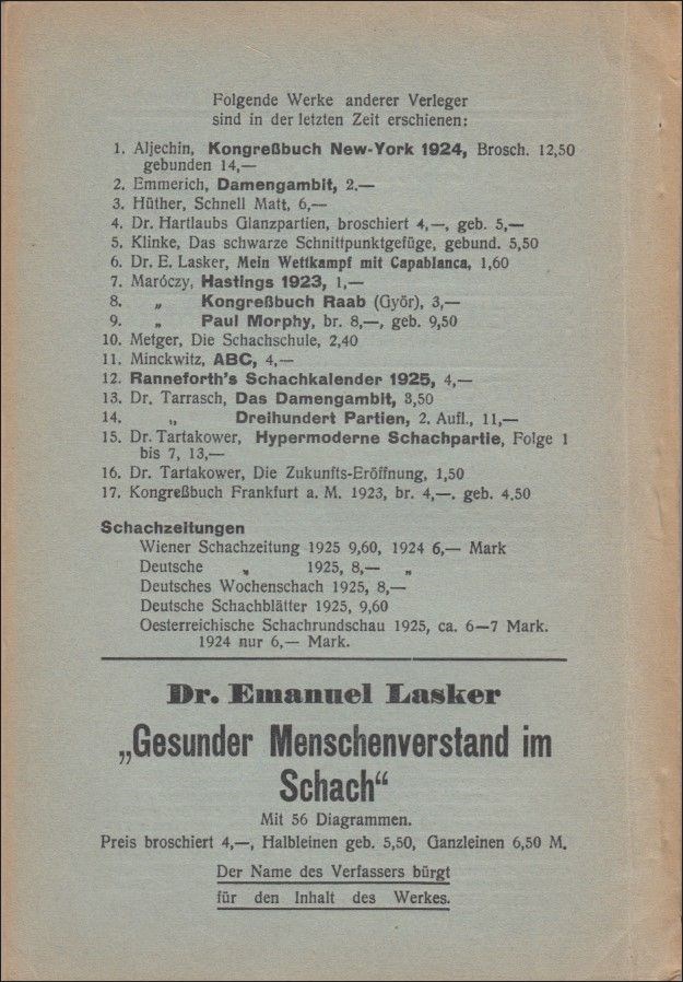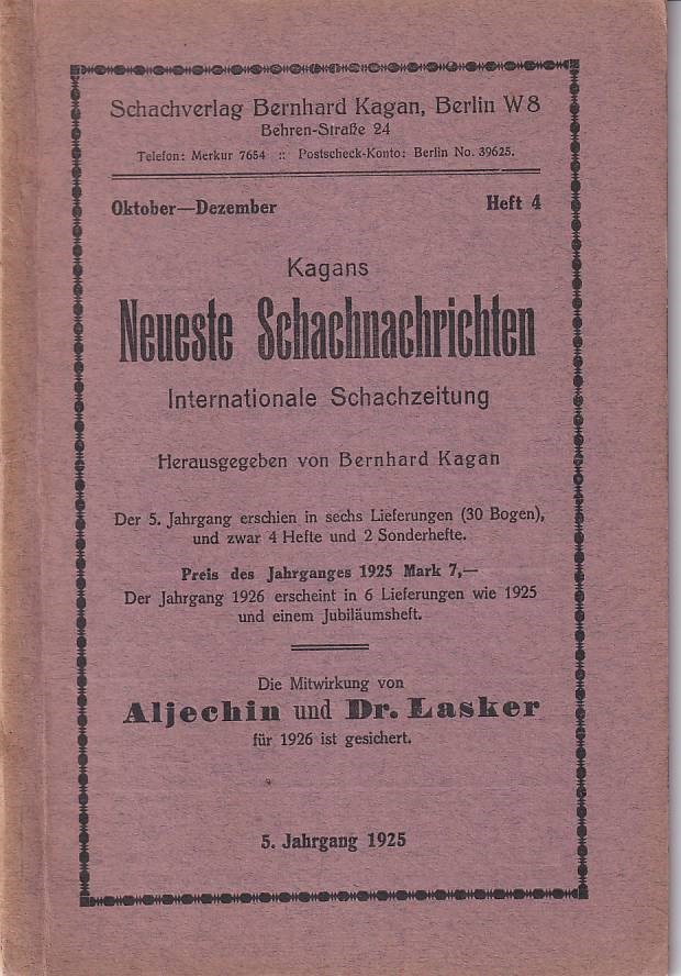 Kagans Neueste Schachnachrichten 1925. Vol. 5. No. 1-4 published in 6 issues. Heft1 [1-120], Sonderheft1 [121-136], Heft2 [139-274], Heft3 [275-346], Sonderheft2 [347-394] and Heft4 [395-490]. The missing pages 137-38 are most likely due to a pagination error. Algebraic notation. Many diagrams. A few photos in text. 490 pages. Index on pp. 272-73 (covering Heft1, SH1, Heft2) and index on p. 490 (covering Heft3, SH2, Heft4). No title page. Covers are soft cardsboards with ads on the inside and on the back page. Various colors. 23 cm. Stapled. Bernhard Kagan, Berlin. L/N 6073. Kieler Schachkatalog 142. Felice 1236.