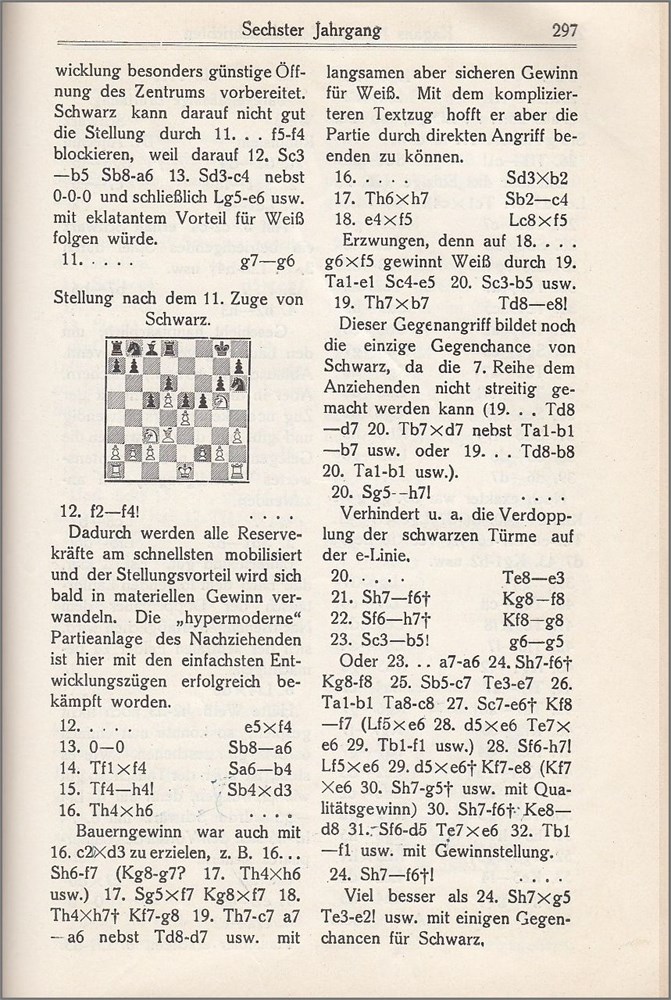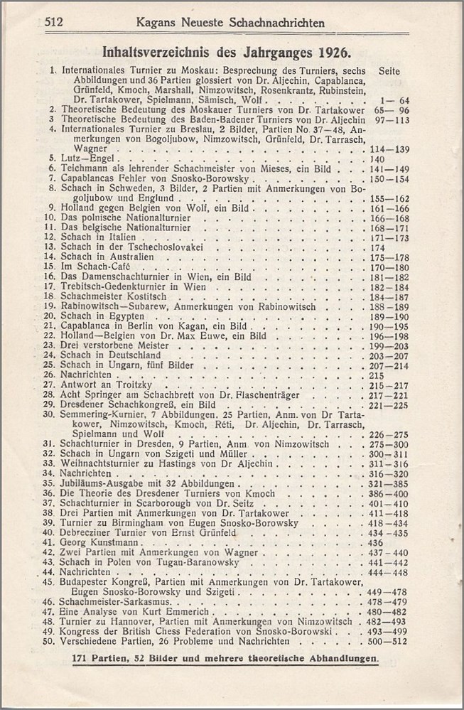 Kagans Neueste Schachnachrichten 1926. Vol. 6. No. 1 - 4 printed in 9 issues. Erste Extra-Ausgabe [1-32], Heft 1a [33-64], Sonderheft no. 1 [65-96], Heft 1b [97-224], Sonderheft no. 2 [225-256], Heft 2 [257-320], Jubiläums-Ausgabe [321-384], Heft 3 [385-448], Heft 4 [449-512]. Algebraic notation. Many diagrams. A few photos in text. 512 pages. Index, 1 page was published on pp. 512. No title page. 23 cm. Bernhard Kagan, Berlin. L/N 6073. Kieler Schachkatalog 142. Felice 1236.