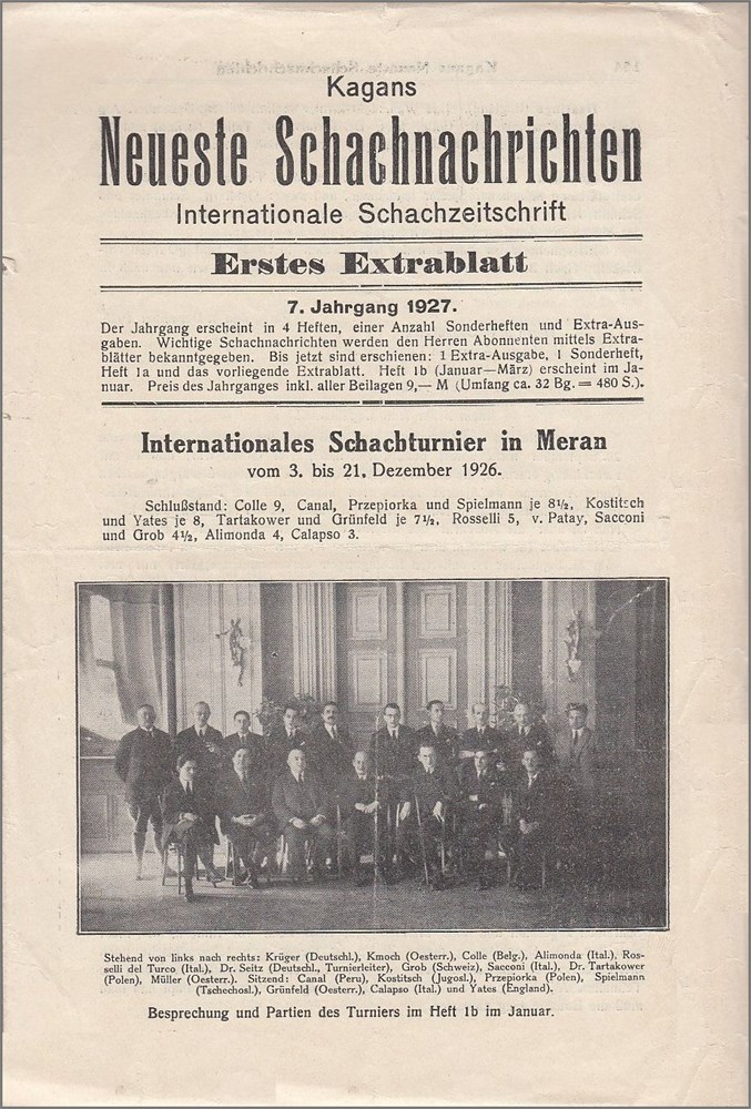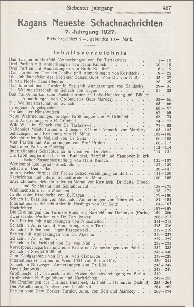 Kagans Neueste Schachnachrichten 1927. Vol. 7. No. 1 - 4 printed in 14 issues. Erste Extra-Ausgabe [1-32], Erstes Sonderheft [33-72], Heft 1a [73-152], Erstes Extrablatt [153-156], Heft 1b [157-188], Heft 2a [189-252], Heft 2b [253-284], Heft 2c [285-316], Heft 3 [317-412], Heft 4a [413-428], Heft 4b (Schlussheft) [429-468]. Many diagrams. A few photos in text. 468. Index, 2 pages was published on pp. 467-68. No title page. 23 cm. Bernhard Kagan, Berlin. L/N 6073. Kieler Schachkatalog 142. Felice 1236.