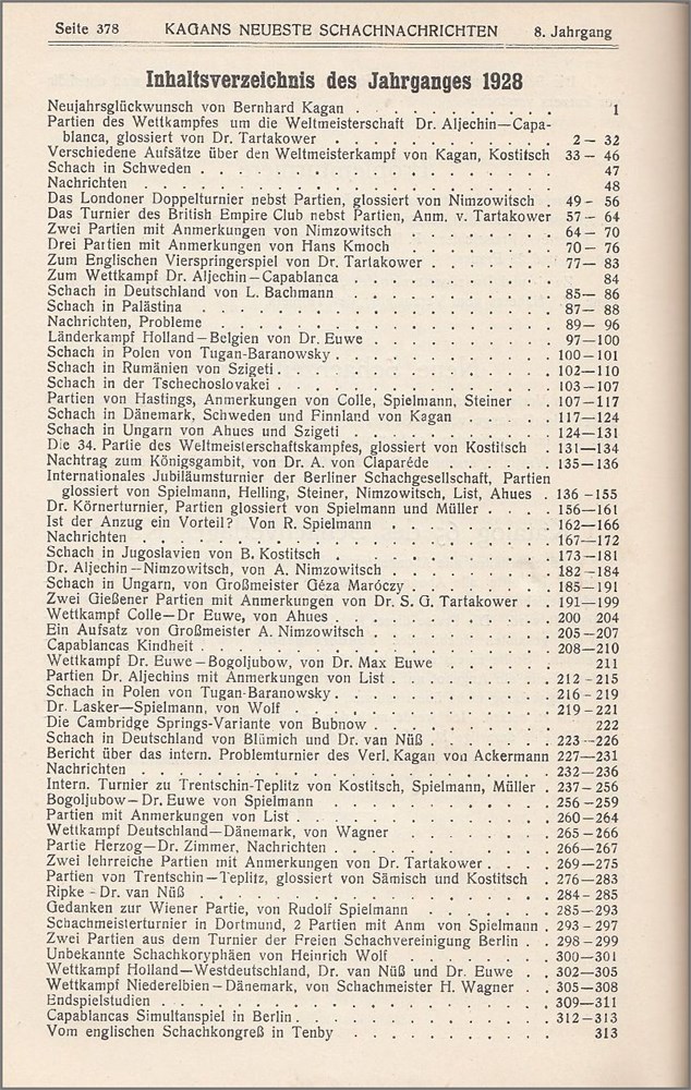 Kagans Neueste Schachnachrichten 1928. Vol. 8. No. 1-12 printed in 9 issues. Number 5/6, 9/10 and 11/12 are double numbers. Algebraic notation. A few photos. Many diagrams. 380 pages. Index, 2 pages was published on pp. 378-79. No title page issued. Covers are soft cardsboards with ads on the inside and on the back page. Various colors. 23 cm. Stapled. Bernhard Kagan, Berlin. L/N 6073. Kieler Schachkatalog 142. Felice 1236.
