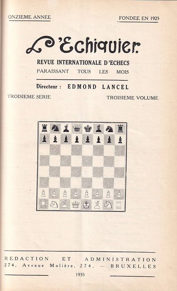 L'Echiquier. 11th year 1935, No. 121/122 (January/February) - No. 132 (December), [3rd series, third volume, No. 25/26 - 36]. Brussels 1935. With many diagrams. 2 leaves, pp. (891) - 1334. With title page and index. Covers bound in.