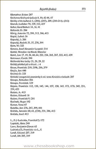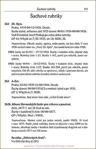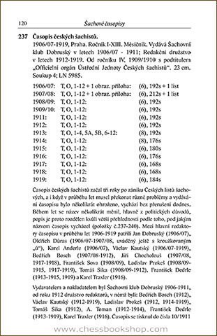 An annotated bibliography of chess literature in Czech language published before 1946. The description contains more than 500 entries, of which ca 260+ are books, 34 magazines and 200+ chess columns in non-chess periodicals. Detailed index in the end.