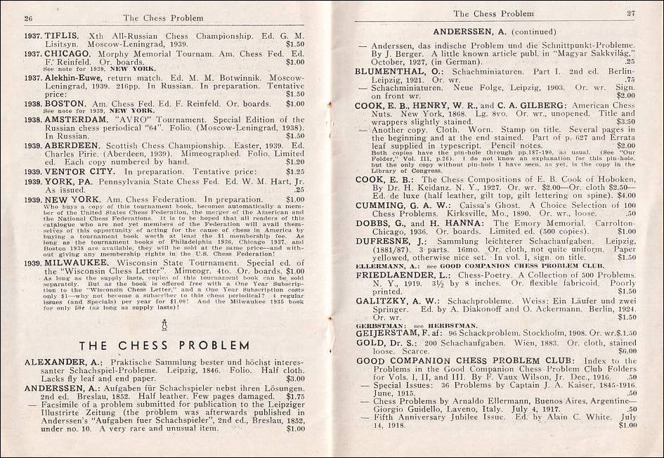 Buschke. Books - Periodicals - Pictures - Autographs - 670 items. Catalogue No. 1. List of magazine offered by the dealer A. Buschke on a range of chess magazines. 670 items divided in 9 categories. Each category is in alphabetical order by author or title and corresponding prices. No illustrations. Pamphlet, stapled. New York 1940. 40 pages. L/N 133.