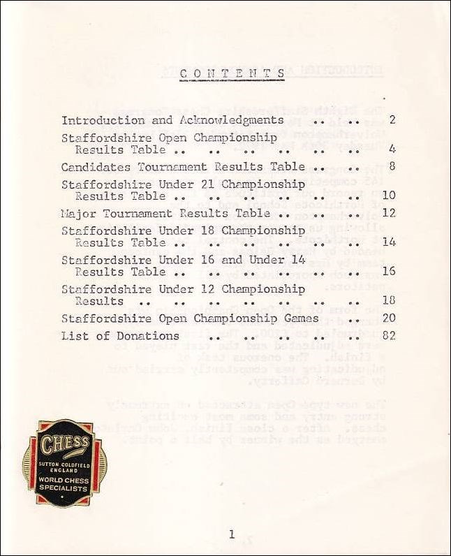 Wolverhampton 1972. Staffordshire Congress (8th). All 96 games from the tournament of which a few have detailed annotations in English. No diagrams. Descriptive notation. Result tables for all classes. J. J. Carleton won. Typescript. Pamphlet, stapled. 20,5 cm. Wolverhampton 1972. Lusis 1642.