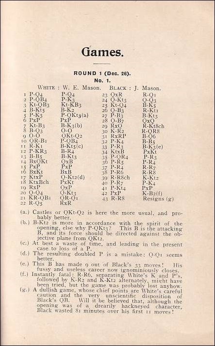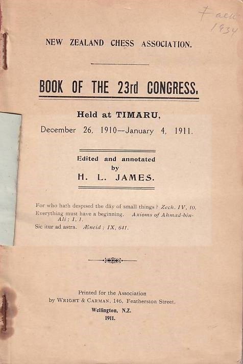 Book of the 23rd Congress, held at Timaru, December 26, 1910 - January 4, 1911. 57 games from the tournament with annotations in English. No diagrams. Descriptive notation. Introduction and report of the tournament (XV). Cross table. Game index. Opening index. W. E. Mason won in front of Davies and J. Mason. 66 pages. 19 cm. Errata snippet. Published by New Zealands chess association, Wellington, Wright & Carman, 1911. L/N 5300. Betts 25 - 49.
