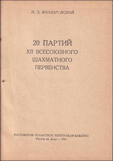 Bondarewski, I. Moscow 1940. Moskau 1940. 20 partiy KHII vsesoyusnogo shakhmatnogo pervenstva. Rostov, Rostovskoye Oblastnoye Knigois'datel'stvo, 1941. 20 games with annotations in Russian from the XII All-Union Chess Championship. Also, with 10 combinations and endings. Cross table. Progress table. Games index. Bondarewski and Lilienthal won. 108 pages, 2 leaves. Original Linen. Rostov, Rostov Regional Publishing House, 1941. Sakharov 511.