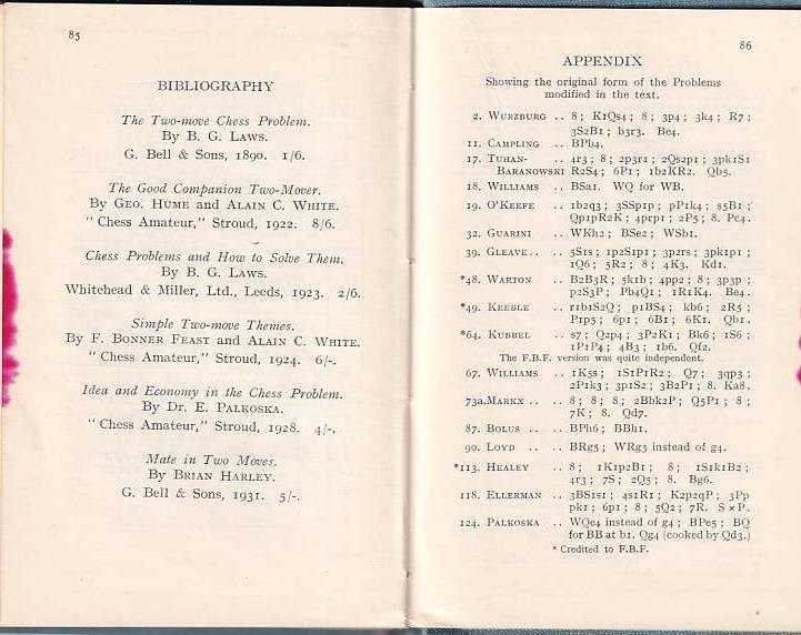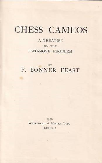 Feast, Frederic Bonner. Chess Cameos. A treatise on the two-move problem. Leeds, Whitehead & Miller, 1936. With many diagrams. 90 numbered leaves. Original cloth. L/N 2782. Betts 34 - 9.