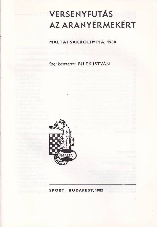 Bilek. Malta 1980. Versenyfutás az aranyérmekért Máltai Sakkolimpia, 1980. Race for the gold medals Malta Chess Olympiad, 1980. No photos. Many diagrams. Hungarian algebraic notation. Cross tables, Statistics, Round-by-round reports. Original red cloth with a dust jacket. The teams of Hungary and the Soviet Union (including Karpov, Tal, and Kasparov) finished in first place with the same number of points, but the tiebreaker decided in favor of the Soviets. 310 pages, 1 leaf. 24,5 cm. Budapest, Sport, 1982.