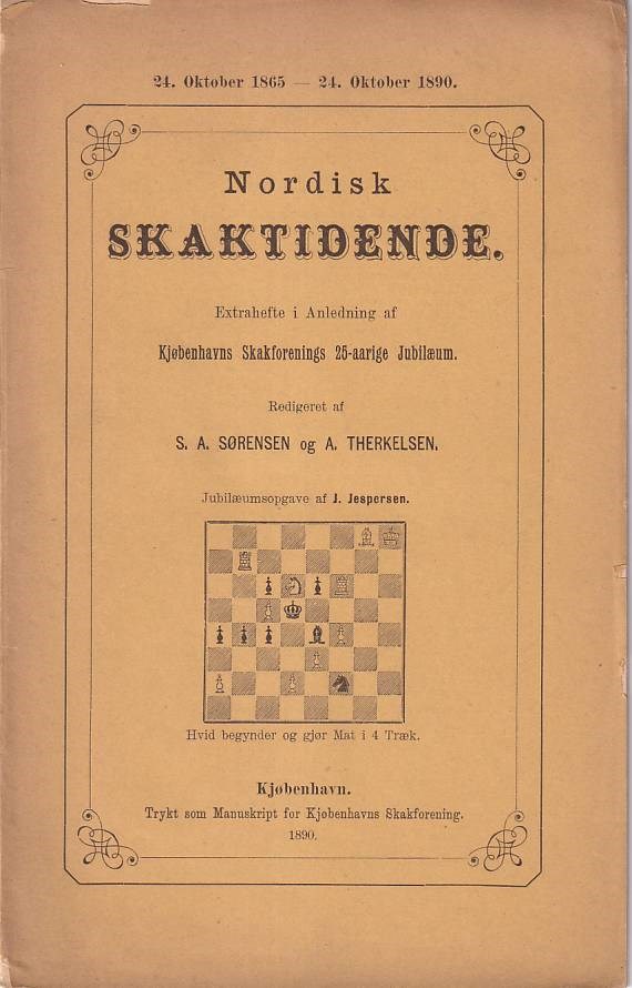 Nordisk Skaktidende. October 24, 1865 - October 24, 1890. Jubilee publication on the occasion of Kjobenhavns Skakforenings 25-year anniversary. Edited by S. A. Sörensen and A. Therkelsen. Copenhagen 1890. With diagrams. 26 pages. Originally pamplet.
