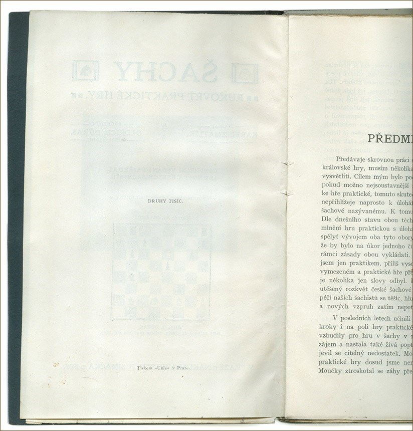 Praha, Simacek, 1909. Orig. softcover. 1st edition, 2nd printing. Frontispiece (O. Duras), 180, (2), (2 ads.) pages + 2 plates (photo from Prague 1908 + photo Lasker-Tarrasch). 240 grams. Published 1,000 copies. Size ca 21.5 cm. Czech. LN (1246). Soukup 130. Mokry 23.