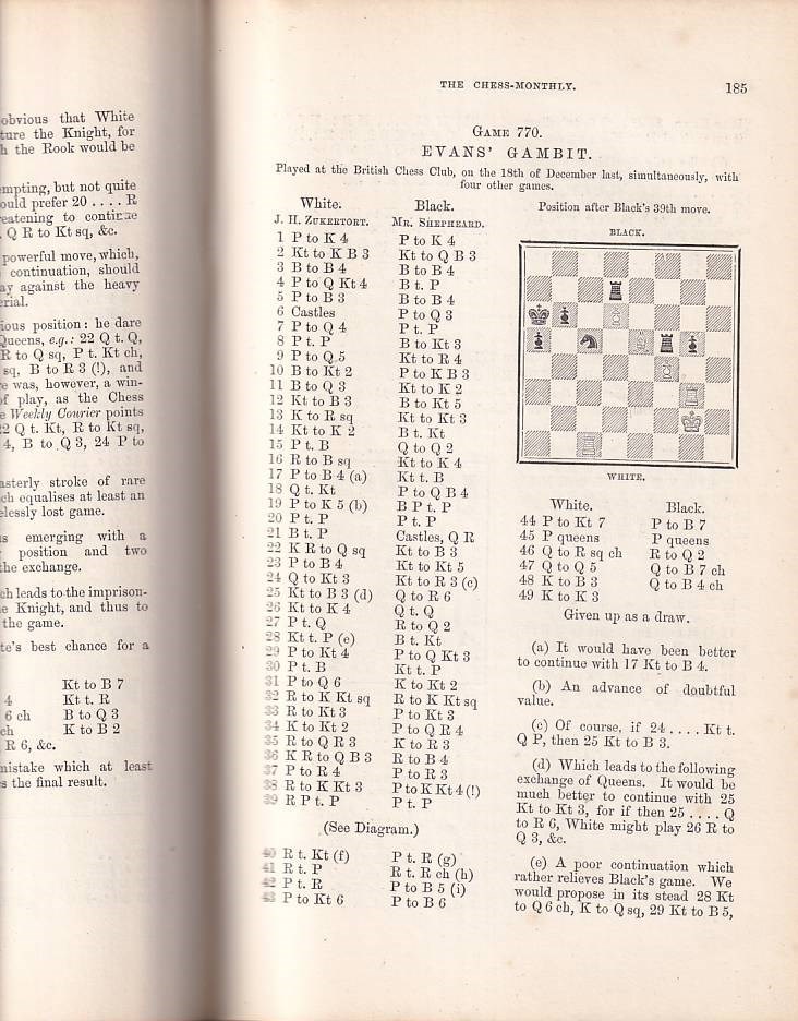 The Chess - Monthly 1886/87 vol 8. Edited by L. Hoffer & J. H. Zukertort. Volume VIII, September 1886 - August 1887. London, Wade, 1886 - 1887. With many diagrams. IV, 380 pages. L/N 6138. Betts 7 - 25. With titlepage and index. Rare and important magazine with a monthly overview of chess events from around the world, chess articles, games, problems, endgames, and book reviews.