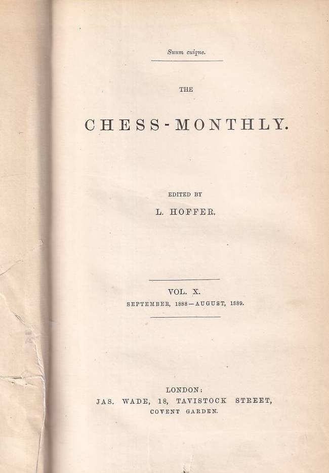 The Chess - Monthly 1888/89 vol 10. Edited by L. Hoffer & J. H. Zukertort.Volume X, September 1888 - August 1889. London, Wade, 1888-1889. With 12 portraits in text and numerous diagrams. IV, 380 pages. Original binding with gilt title on spine and decorated front cover. With collector's bookplate of Lothar Schmid. L/N 6138. Betts 7 - 25. With titlepage and index. Rare and important magazine with a monthly overview of chess events from around the world, chess articles, games, problems, endgames, and book reviews.