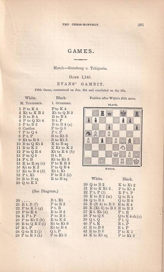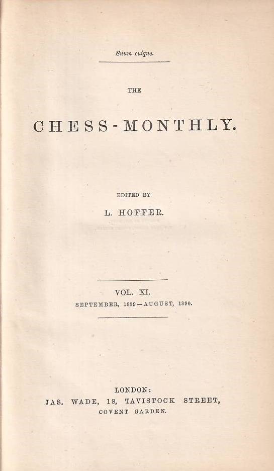 The Chess - Monthly 1889/90 vol 11. Edited by L. Hoffer & J. H. Zukertort. Volume XI, September 1889 - August 1890. London, Wade, 1889 - 1890. With 13 portraits, 1 illustration in text and many diagrams. IV, 380 pages. Original binding with gilt title on spine and decorated front cover. With collector's bookplate of Lothar Schmid. L/N 6138. Betts 7 - 25. With titlepage and index. Rare and important magazine with a monthly overview of chess events from around the world, chess articles, games, problems, endgames, and book reviews.