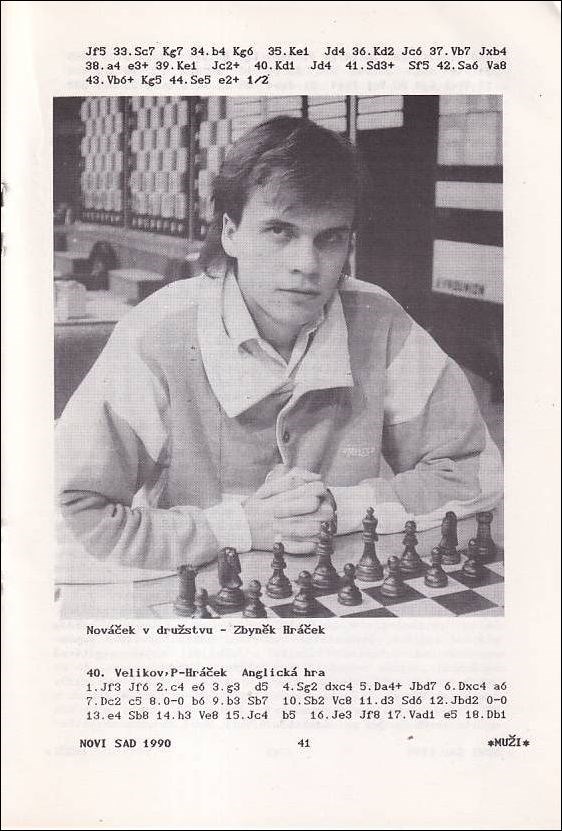 Šachová Olympiáda Novi Sad 1990. 98 selected games without annotations by Czechoslovakian players at the olympiad at the open section and at the womens olympiad. Some diagrams. Czech algebraic notation. Some photos in medium quality. Round-by-round reports. Statistics on individual players. USSR won in front of USA and England. 80 pages. Pamphlet, stapled. Kangaroo Chess, Prague 1991.