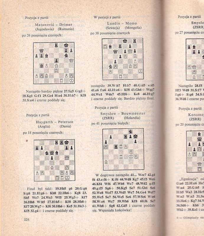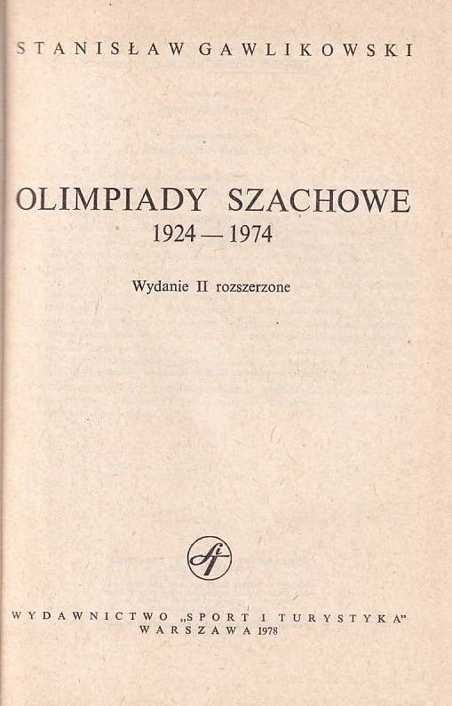 Olimpiady Szachowe 1924–1974 by Stanisław Gawlikowski is a Polish-language history of the Chess Olympiads spanning the first decades of international team chess competition. First published in 1976 it runs to 547 pages and was issued by Sport i Turystyka in Warsaw. The book covers every Olympiad from 1924 (including the unofficial 1924 Paris event) through 1974, presenting reports, results tables, and many notable games from each tournament. It was written with the aim of giving readers both the historical narrative and competitive highlights of these major events, with particular attention to such Olympiad traditions and performances over the decades.