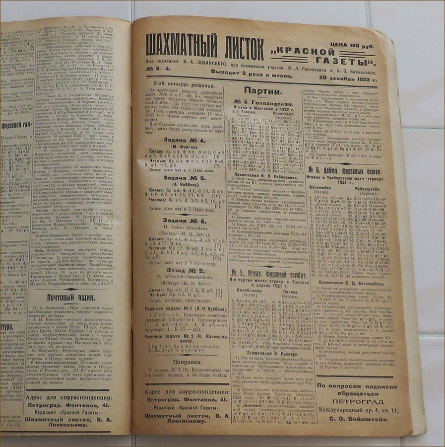 The magazine Shakhmatny listok was published since August 1922 to June 1931, marked as volumes 2-11. In 1922-23 weekly, since 1924 fortnightly. Its predecessor - Listok shakhmatnovo kluba Peterburgkomuny was published in 1921 and is considered as volume 1. From issue 13/1931 Shakhmatnyj listok was renamed to Shakhmaty v SSSR.