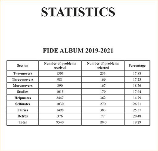 The official selection of the world's best chess compositions of the period 2019-2021 contains 1840 compositions from ca 300 authors, sorted into 8 sections: Two-movers, Three-movers, Moremovers, Endgame studies, Helpmates, Selfmates, Fairies, Retros. The number of problems in each category can be found in the second picture.