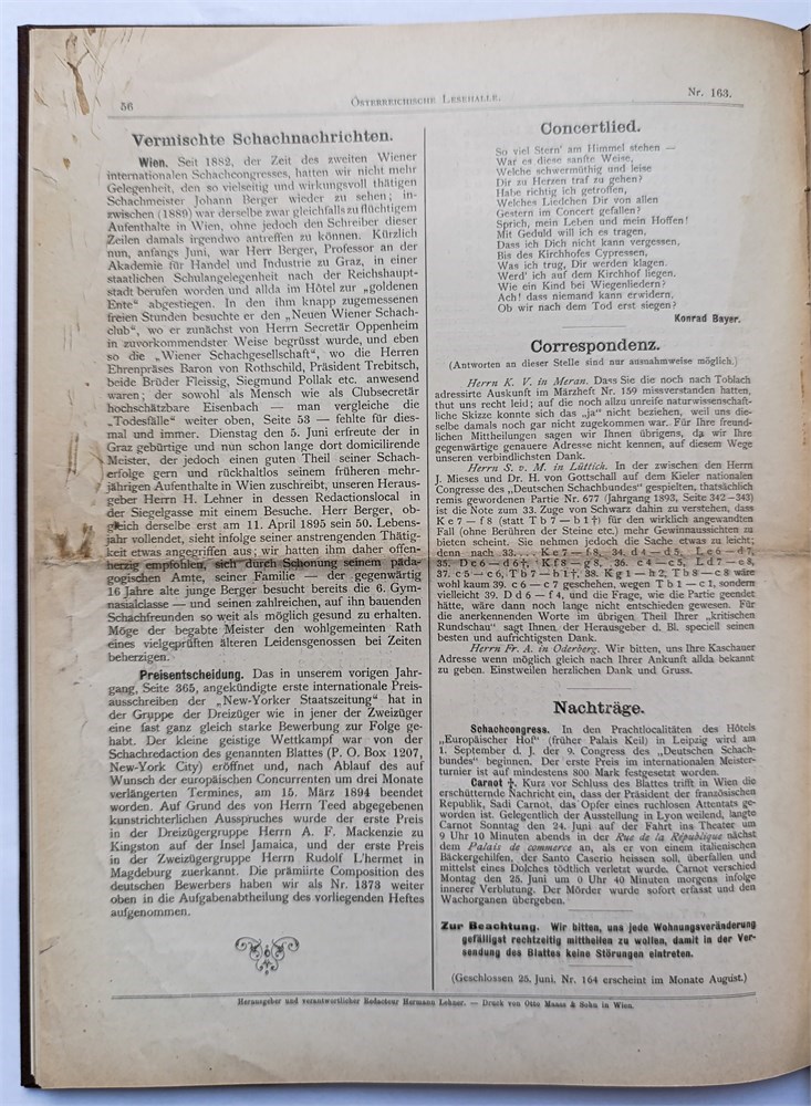 Oesterreichische Lesehalle. Monatsschrift für Unterhaltung und Belehrung. Herausgegeben und unter Mitwirkung zahlreicher Mitarbeiter redigirt von Hermann Lehner. Wien, self-edition, 1894. In German. Title page, index, issues 1-12 (Nos. 157-168), 96 pages. Complete volume 14. Covers not issued. LN 5955. Di Felice 1721. Kieler Schachkatalog 183.