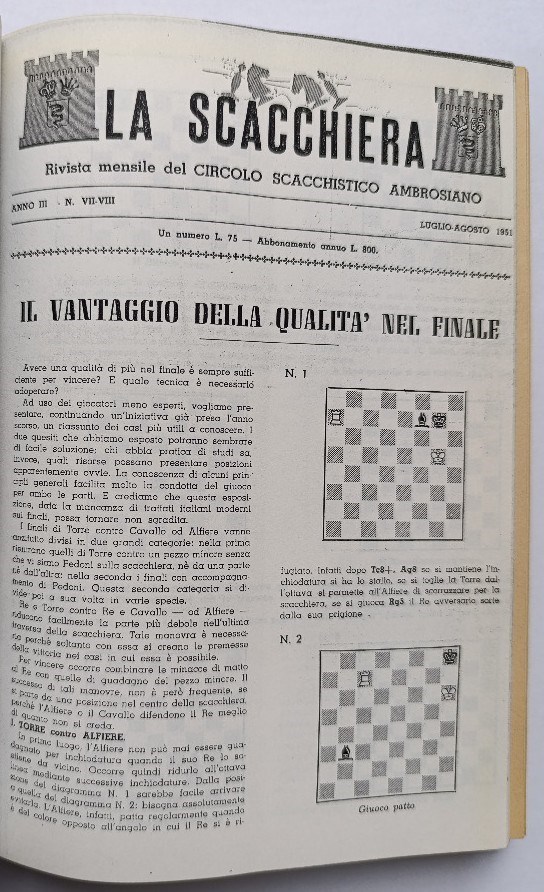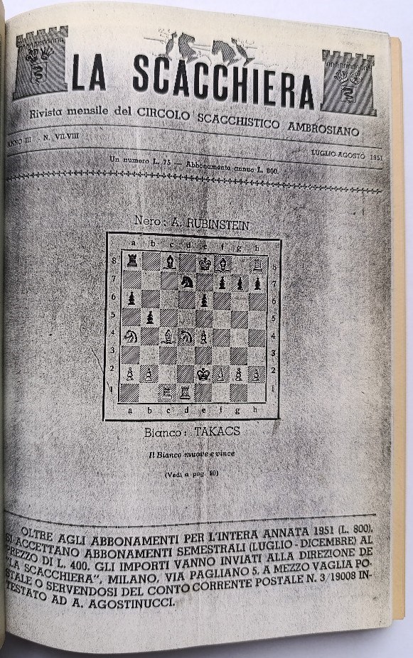 La Scacchiera was an Italian chess monthly that was published from January 1949 to May 1956. It covered both practical chess and chess composition. In this auction, I am offering a complete run of this quite rare magazine.
