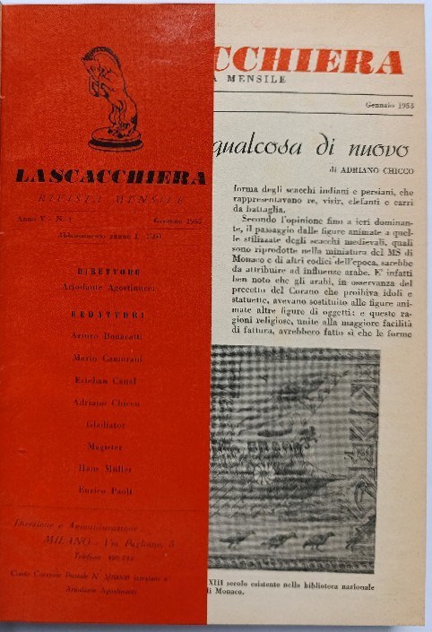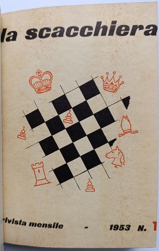 La Scacchiera 1953. Rivista mensile. Monthly. In Italian. Editor and Publisher Ariodante Agostinucci. Milano, 1953. Issues 1-12 (7-8 is double issue). Title page and index not issued. 268 pages. Volume 5. All covers bound in. LN 6190. Sanvito 906. New Sanvito 3108. Di Felice 2147.