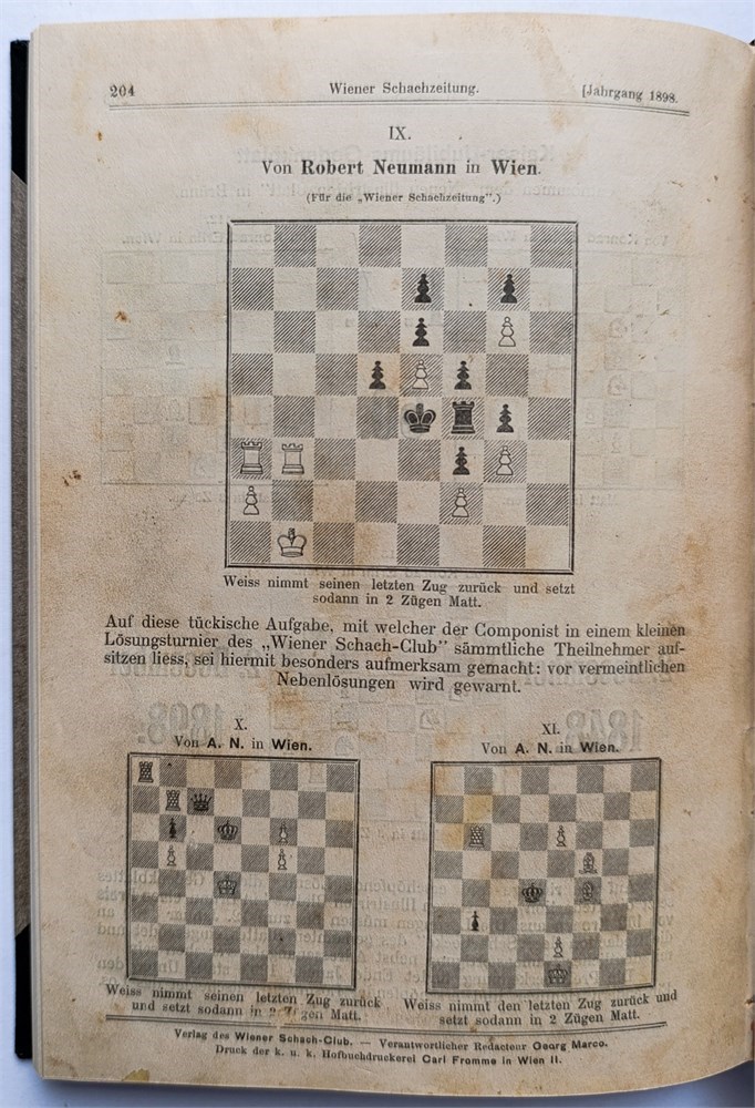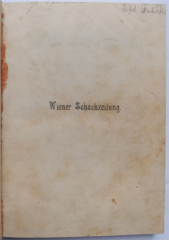 Wiener Schachzeitung 1898. Organ des “Wiener Schach-Club”. Monthly. In German. Editors: M. Fändrich, A. Halprin, G. Marco. Issues 1-12. Half-title, title, index (VII), 204 pages. Volume 1. Covers not bound. LN 5957. Di Felice 2793.