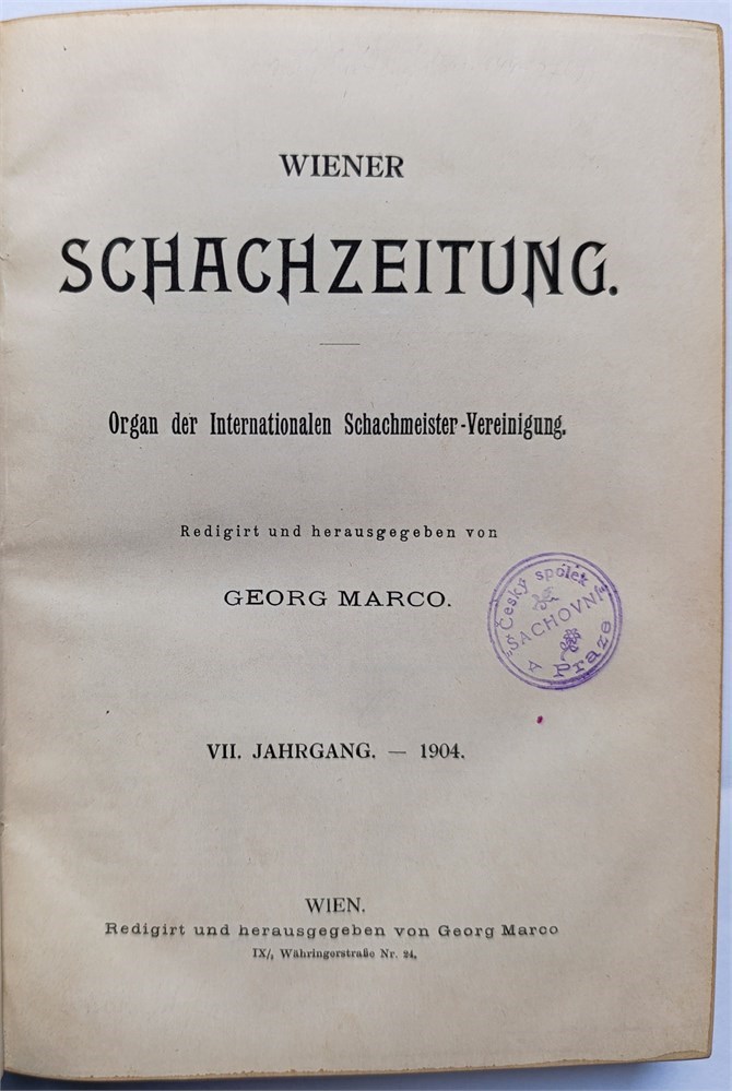 Wiener Schachzeitung 1904. Organ der Internationalen Schachmeister-Vereinigung. Monthly. In German. Editor: Georg Marco. Issues 1-12 (2/3, 4/5, 8/9 and 10/11 are double issues). Title page, index (VIII), 380 pages. Volume 7. Covers not bound. LN 5957. Di Felice 2793.