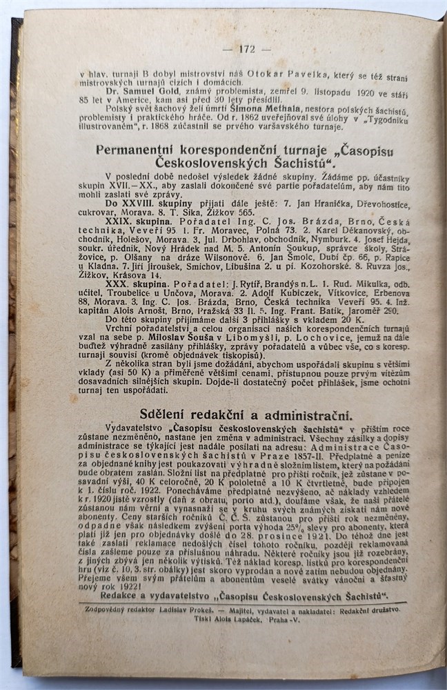 Casopis ceskoslovenskych sachistu 1921. Oficielni organ Ustredni jednoty ceskoslovenskych sachistu. Praha. Editors: Frantisek Dedrle, Vaclav Kautsky, Ladislav Prokes. Monthly. In Czech. Title page, index, 172 pages. Issues 1-12 (6/7 and 8/9 are double issue). Volume 15. Covers not bound. LN 5985. Soukup 5. Mokry 238. Di Felice 443.