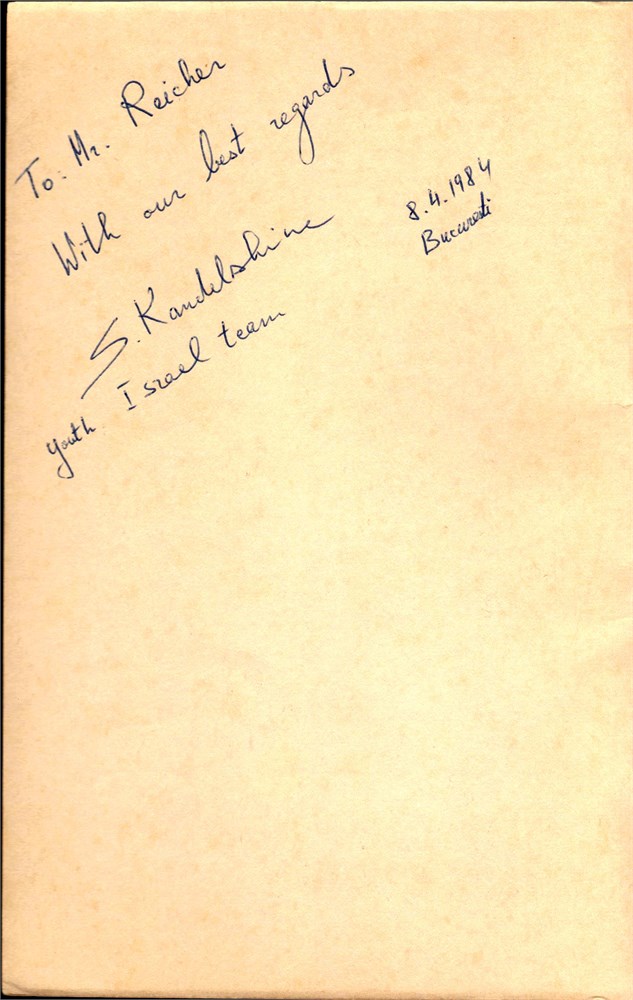 Dedication and signature on the 2nd cover by "S. Kandelskine, youth Israel team".