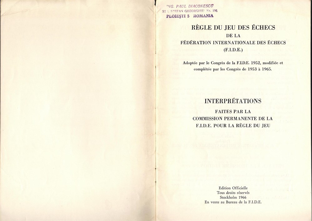 F.I.D.E. - La Regle du Jeu des Echecs. Interpretations, Stockholm 1966, 23 pages, SC, size 15x23 cm, in French.