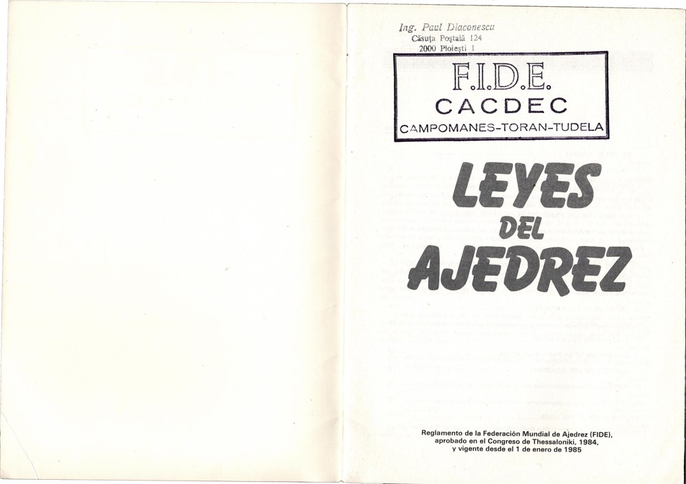 Leyes del Ajedrez, Madrid, 1985, 20 pages, SC, size 15x21 cm. In Spanish.
