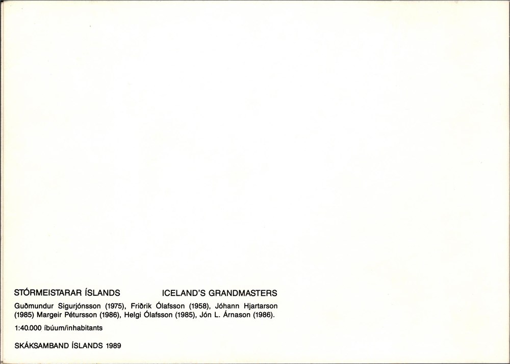 Greeting card (17,5x12 cm) dated 1989, with a group photo of Iceland's Grandmasters: Sigurjonsson, F. Olafsson, Hjartarson, Petursson, H. Olafsson, Arnason.