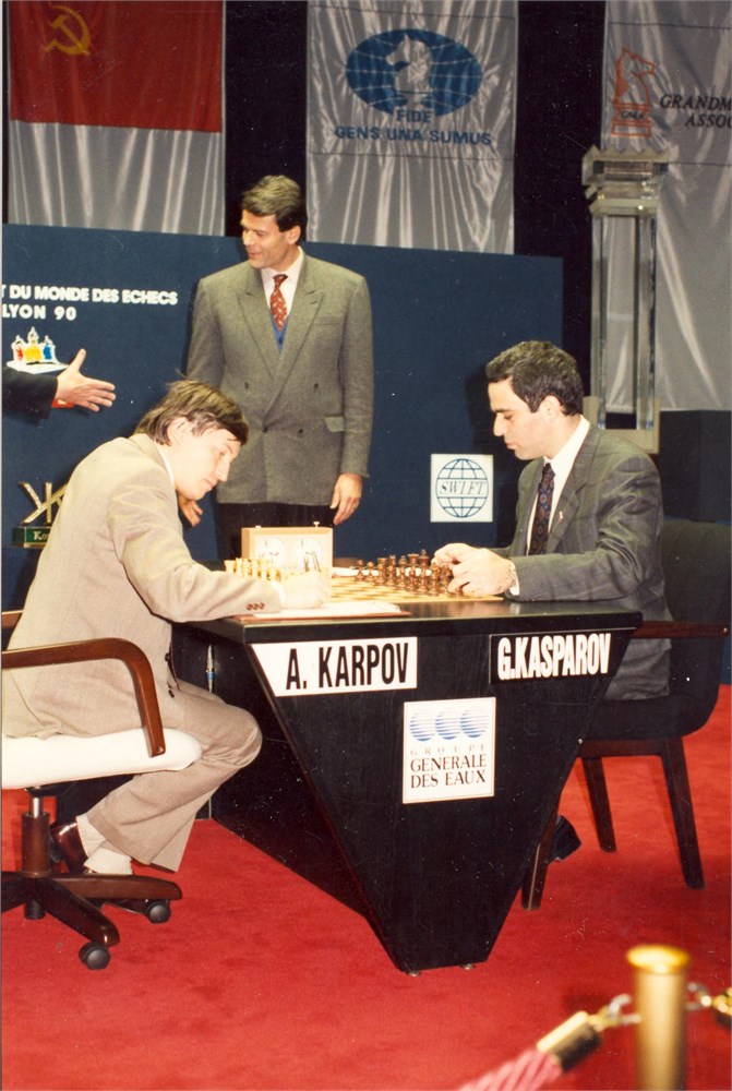 Anatoli KARPOV (playing white) vs. Garri KASPAROV at the chess table, assisted by an official. Karpov is writing his first move in a game for World chess title in (New York &) Lyon, 1990. Colored photo, size 10x15 cm. Foto: Scacco, 1990.