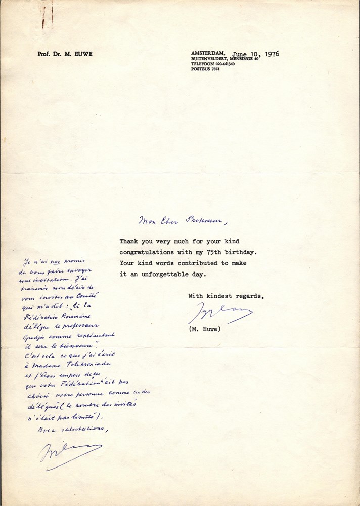 Letter from Max EUWE, President of F.I.D.E., to Ion GUDJU, founder member of F.I.D.E., dated "Amsterdam, June 10, 1976", size A4, with en-tete of Euwe, one side type-written, with much text hand-written and signed in original by Euwe. In French. Condition: good. [SM.01.006]
