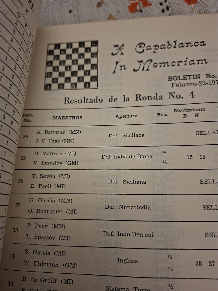 I am selling a super rare(haven t found on the net that someone is selling this) tournament bilten book from the 1973 in Cuba ( Cuanfuegos), from the memorial tournament of Capablanca. The book has 180 pages and it includes all the parties and all the chess sheets played there. An absolute jewel for all the lovers of Capablanca.