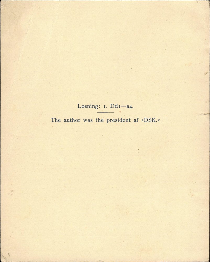 Dansk Skakproblem Klub - Pre-printed postcard, size 11x14 cm, dated "Kobenhavn, Julen 1932" with a problem of K. FABRICIUS-LAURITZEN, former Presodent of DSK and the solution on opposite side. Condition: good, upper right corner somewhat folded. [PC.02.008]