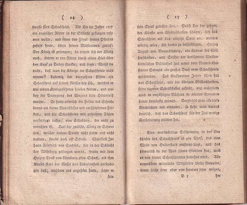 Johann Christian Bernstorf Uflacker (d. 1800) was a pastor in Ohrum. This edition contains chapters on the nature, history, and mechanics (rules and moves of the pieces) of chess, as well as on chess theory. At the end is a practical appendix, which includes, among other things, a sample game by Gustavus Selenus and an endgame by Stamma. From page 25 onward, there is also a short article about the village of Ströbeck.