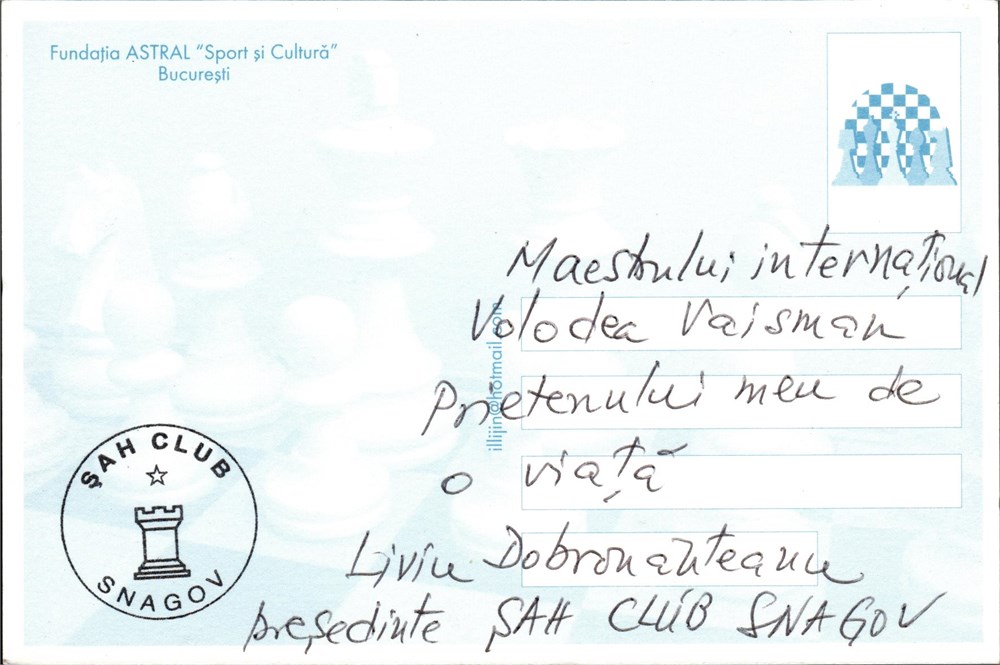 Postcard dedicated to the chess match Veselin TOPALOV - Dieter NISIPEANU, 06-09.iv.2006, Bucuresti, ROU. On reverse side, a dedication of Liviu Dobronăuțeanu, president of a chess club, for IM Volodea Vaisman. Condition: very good. [PC.02.066]