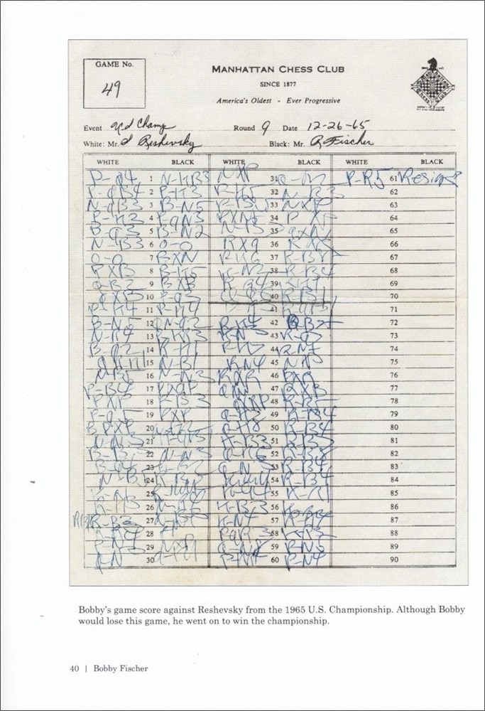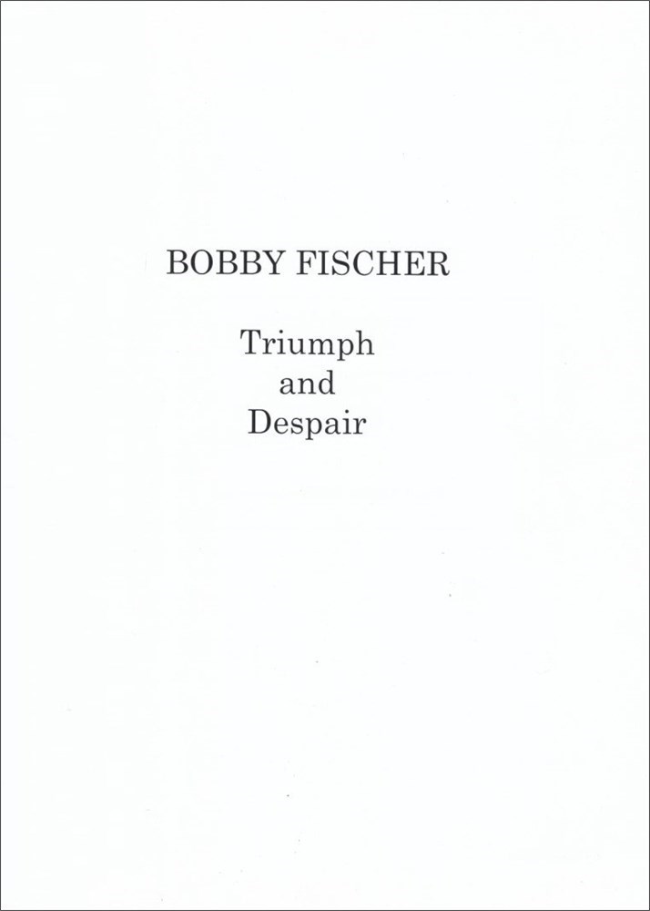 Bobby Fischer Triumph and Despair. Pictorial account of all sorts of Fischer items, accumulated over the years by the author. This monumental work is an extension of Bobby Fischer Uncensored, including a complete 1999 diary written in Fischer's hand (300+ pages), 8 Fischer annotated games from Herceg Novi 1970, 7 unrecorded training games (1992) between Fischer and Gligoric (6) and Torre (1), over 100 pages of correspondence between Fischer and Gligoric from 1973-1995, the Ed Edmondson notes from the early to mid-1970's regarding Fischer telephone conversations, a 62-page typescript by Fischer elaborating the differences between the Batsford and Simon & Schuster editions of 'My 60 Memorable Games', 2 letters written by Fischer to the U.S. consulate while incarcerated in the detention center in Japan and other letters and memorabilia of Fischer. Foreword by Alessandra De Lucia. Epilogue and bibliography. Bound hardcover in solid black slip case. 786 p. 28 cm x 23,5 cm. Private edition - Darien, CT, 2009.