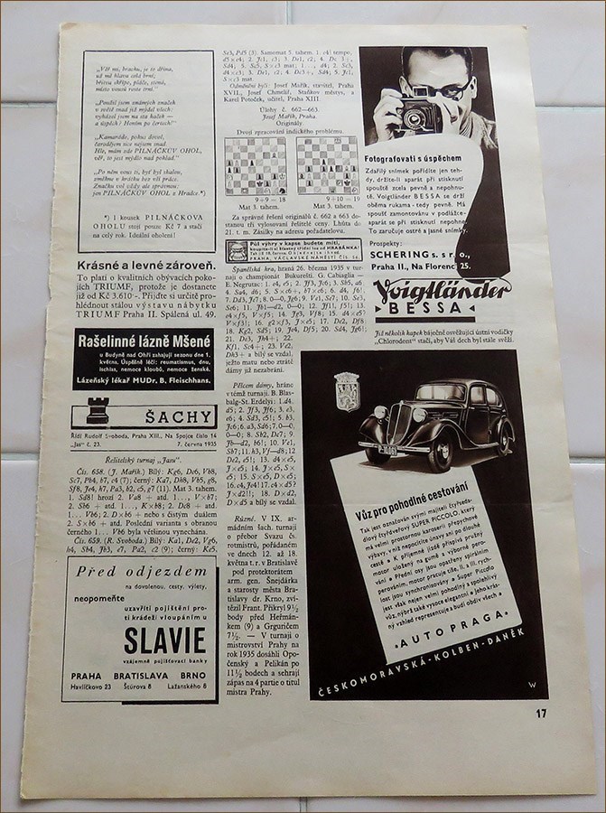Praha, 06/01/1927-09/02/1940. Loose sheets disbound from the magazine issues. Large size ca 35 x 25 cm. The weight 3,000 grams. Whyld: Chess Columns page 217; Mokry 303. In Czech.