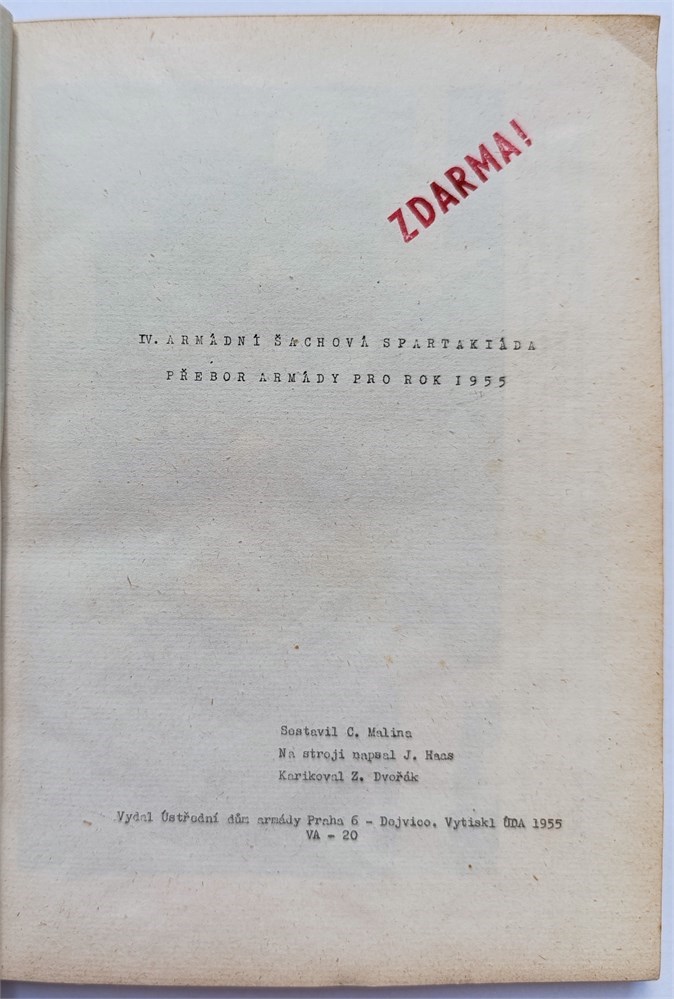 Malina C. IV. armadni sachova spartakiada. Prebor Armady pro rok 1955. Praha, Ustredni dum armady, 1955. In Czech. Title page, 3 plates with photos, pages 2-75 (printed on recto only), 3 leaves. Mimeographed. Original half-cloth binding with lettering and decoration on front cover. Di Felice 1753.1.