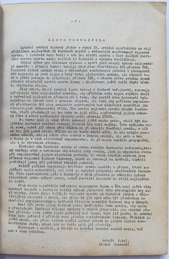 Tournament book of the Czechoslovak Army Championship held in Prague from August 7 to 25, 1955. It contains all 231 games, round summaries, player caricatures by Z. Dvorak, crosstables, index of openings and 5 photos on 3 plates. The winner was Julius Kozma ahead of Ladislav Alster and Miroslav Betak.
