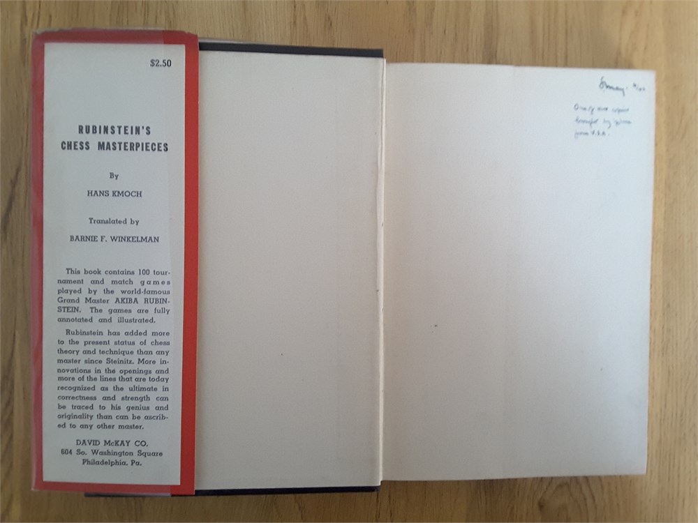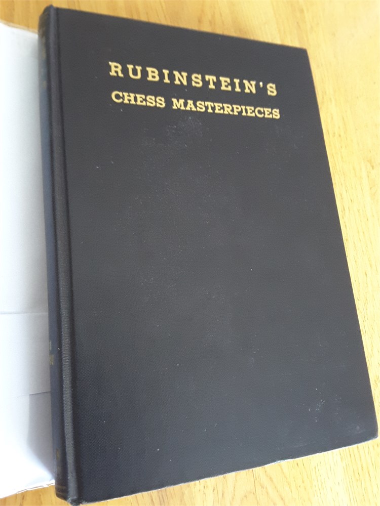 "Rubinstein's Chess Masterpieces" by Hans Kmoch. Published in hardback by David McKay in 1941. First Edition. 192pp. Betts 29-126. The book is in near Very Good condition for its age. The binding is tight and there is no shelf lean or bowing present. The top edge block has dust discolouration but the other two are clean. The boards are clean. The gilt lettering on the spine has faded but is still readable. The gilt lettering on the front board is still strong. Internally there is a name and short note (dated 1942) in pen on the front endpaper. Aside from this, the book appears to be inscription, annotation and foxing free. The pages have very light age-tanning but this is to be expected in a book published during WW2. The dustjacket is in Good Plus condition for its age. It has very small areas of loss to the head and tail of the spine (see scans) plus a closed tear on the rear panel. There is also a very small area of loss to the rear panel, up in the top left hand corner. The top edge of the front panel has mild crinkling. The spine area is lightly age-tanned. The dustjacket is now protected by a removable see-through sleeve. Book Condition: 7.5/10. Dustjacket Condition: 7/10. Games are given in English descriptive notation. Further scanned images are available on request. A nice copy of a sought after chess book. Postage extra, from either the Republic of Ireland (via 'An Post') or from Northern Ireland (via 'Royal Mail'). Any questions, please just ask.