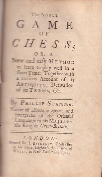 The Noble Game of Chess; or, a new and easy method to learn to play well in a short time: together with a curious account of its antiquity, derivation of its terms. By Philip Stamma, native of Aleppo in Syria; and interpreter of the Oriental languages to his majesty the king of Great-Britain. London: Printed for J. Brindley, Bookseller to his Royal Highness the Prince of Wales, in New Bond-street. 1745. XXIV, 74pages. + The Second Part: consisting of a hundred games, in various and particular situations, with the manner of playing them. 1 leaf, 115 pages. Fold-out diagram after p.XX. L/N 427. Kieler Schachkatalog 1178.