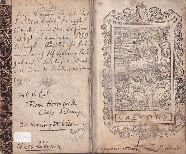 Vida, Marcus Hieronymus. Poemata omnia tam quae ad Christi veritatem pertinent ... Primo loco continentur Hymni de Reb. divinis nunc primum editi Christiados Lib. VI. Second autem volume de arte poetica Lib. III. De Bombyce Lib. II. Scacchia Lib I. Bucolica eclogae III. Carmina diversi ... Cremona, Mutius and Locheta, 1550. 216 leaves, 76 leaves. Parchment. L/N 4558. Kieler Schachkatalog 8139. Brunet V, 1181.