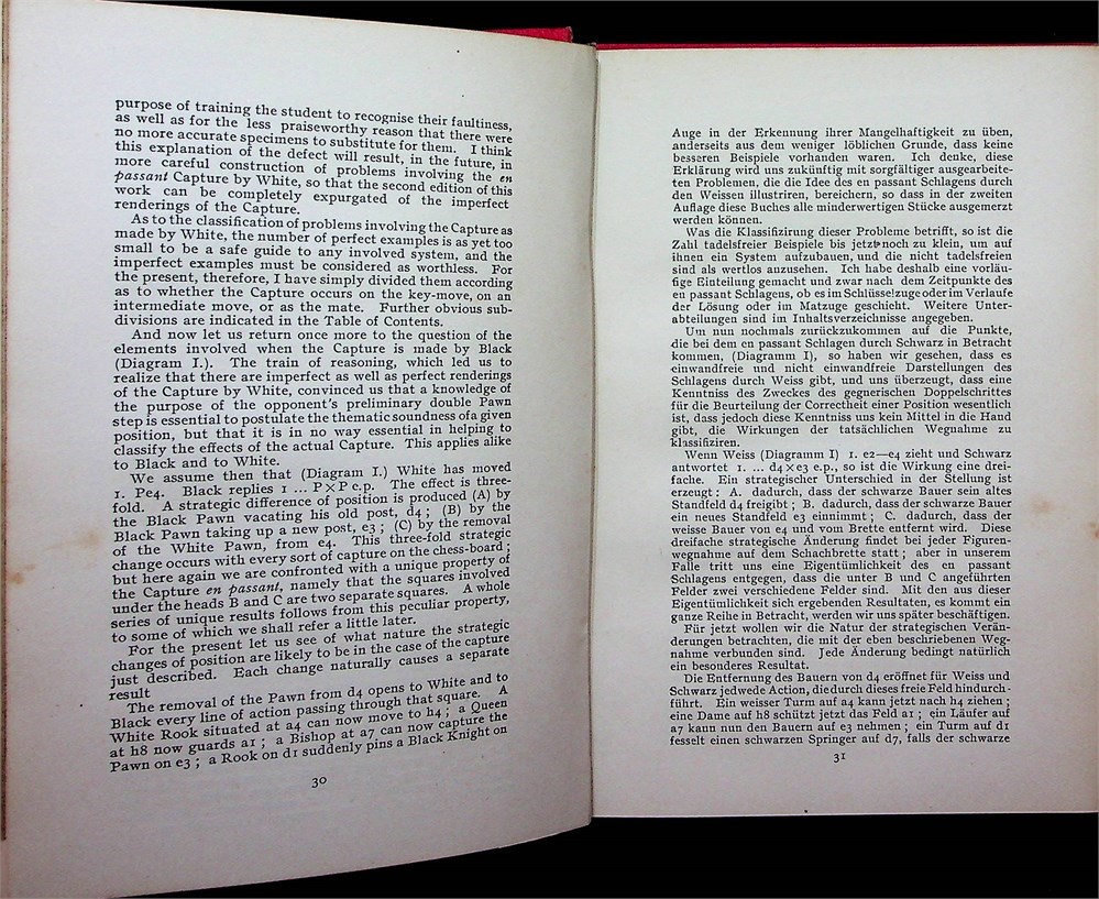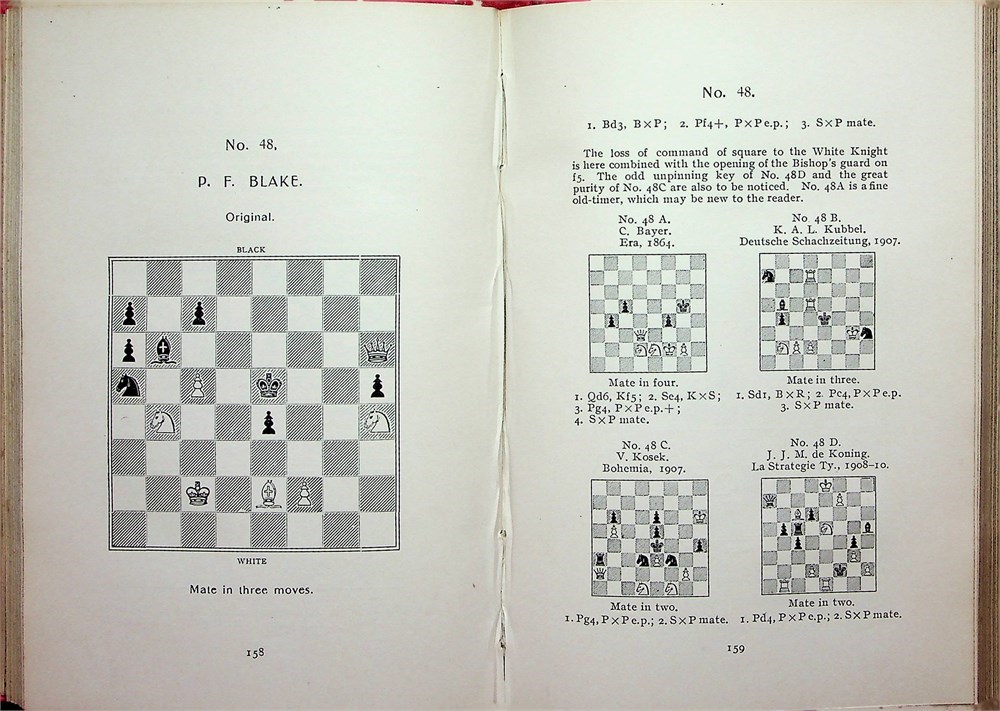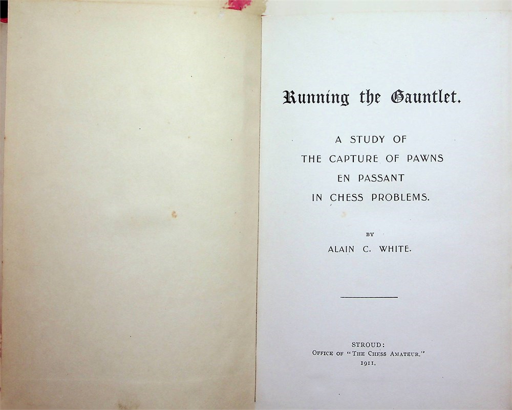 L/N 2615. 269 pages with diagrams. Small Octavo. Bound in original publisher's red cloth with gilt lettering on cover and spine with Christmas greeting by Alain C. White tipped in. Christmas series for 1911. (Betts: 31-7) First edition. The introduction consists of an essay on the development of chess problems, how "two main types of accumulation have marked the progress of composition during the last fifty years: on the one hand, the pursuit of variations, that is the accumulation of different elements in one problem; and, on the other hand, the pursuit of echoes, that is the accumulation of similar elements in one problem". 300 problems (s00 sets of 3) are devoted to these "tasks" and "echoes", grouped under twenty one main thematic ideas, and discussed with solutions.