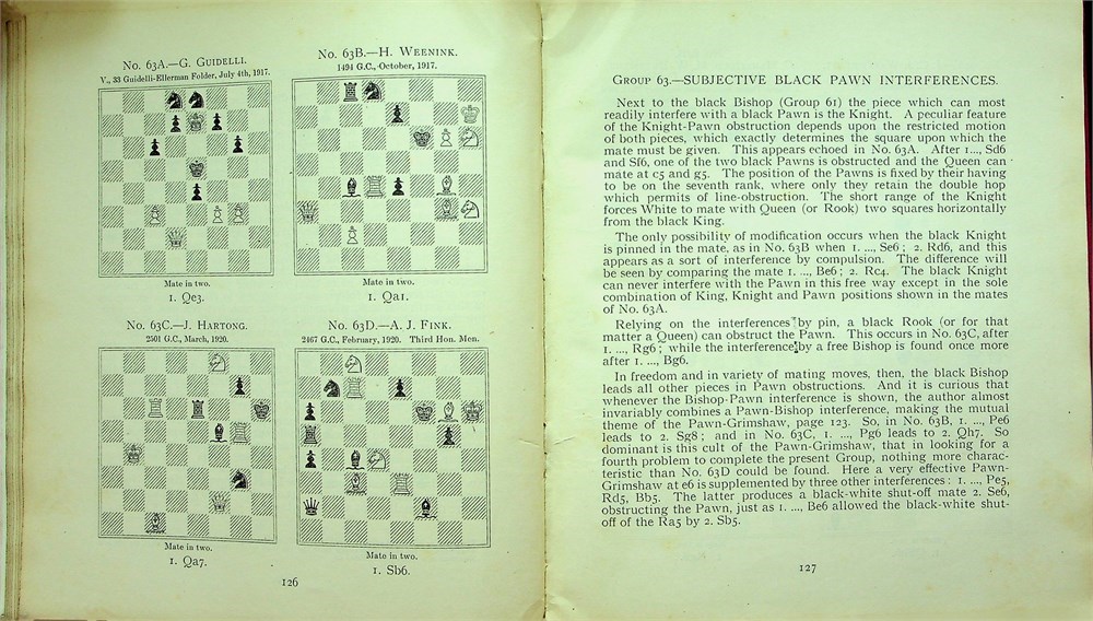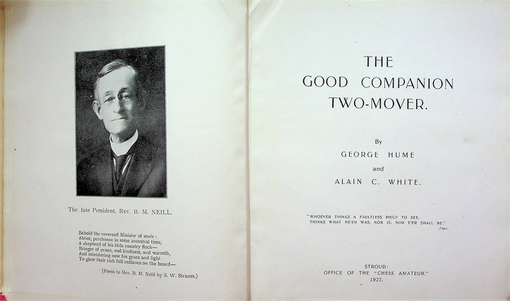 L/N2670. George Hume and Alain C. White: The Good Companion Two-mover /A. C. White Christmas Series 28./ Stroud, 1922. Office of The Chess Amateur. [4 blank] XX. 418 p. 10 t. (pictures) [2 blank] p. with chess diagrams. First edition. Publisher's red full cloth binding. Amateur label pasted on the front endpaper. Altogether 912 problems by 174 members of the Good Companion Chess Problem Club of Philadelphia (the club had over 600 members worldwide). The problems explain 175 problem terms and were originally published in the club magazine 1913-1921. Index of composers, general index. - Publisher of the series was chess composer and enthusiast Alain Campbell White (1880-1951). Includes a Christmas note from Alain C. White.
