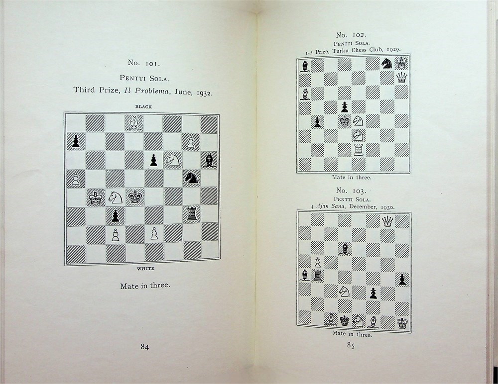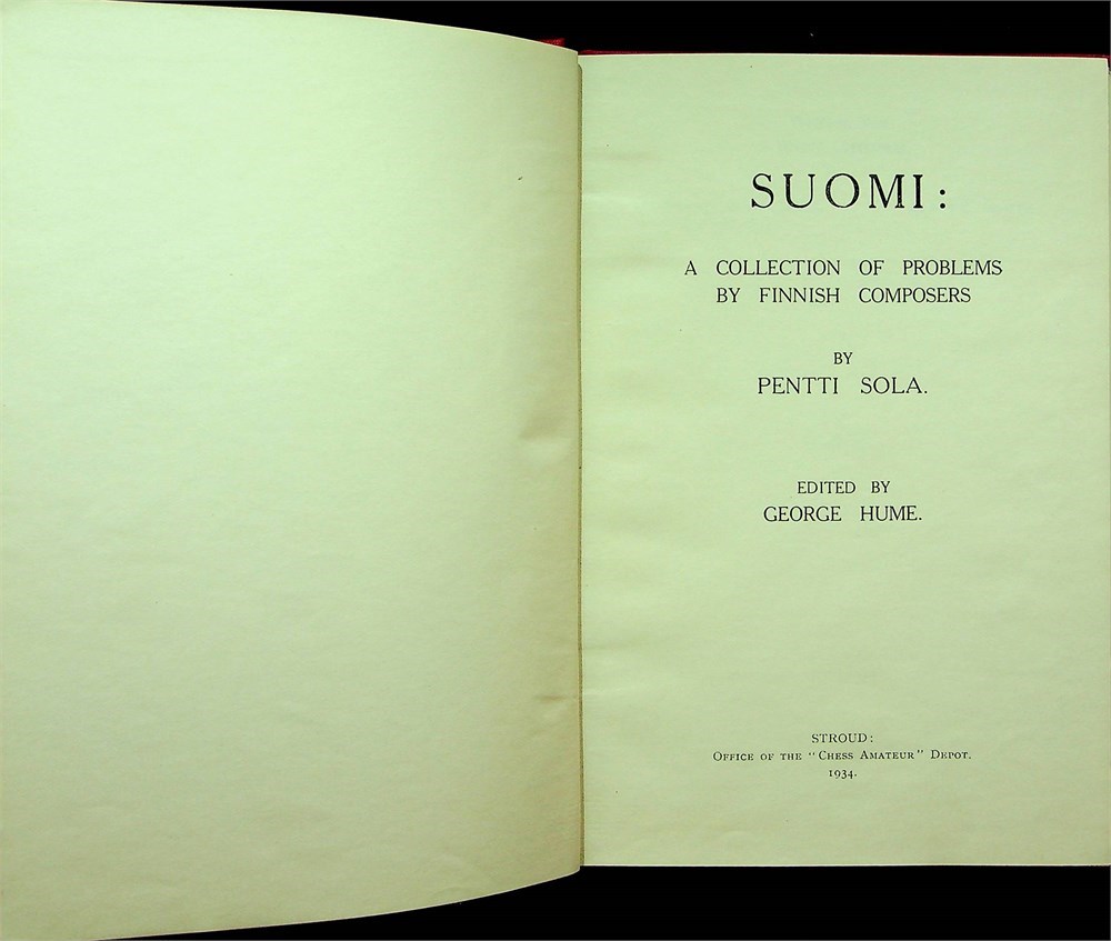 L/N 2764. 141 pages with diagrams. Small octavo (7 1/2" x 5") bound in original publisher's red cloth with gilt lettering to spine and cover. Edited by George Hume. White's Christmas series number 42 with greeting tipped-in. (Betts: 32-31) First edition. Contains 150 problems, mainly two and three move direct mates with some self-mates, with solutions pages 117-137 and indexes of composers and problems. Pentti Sola compiled A Collection of Problems by Finnish Composers in 1934 and it was published in the Christmas Series. He directed the problems section of Suomen Shakki from 1933 until 1936. He composed direct mates and helpmates and was considered as one of the greatest Finnish chess composers. Includes a Christmas note from Alain C. White.