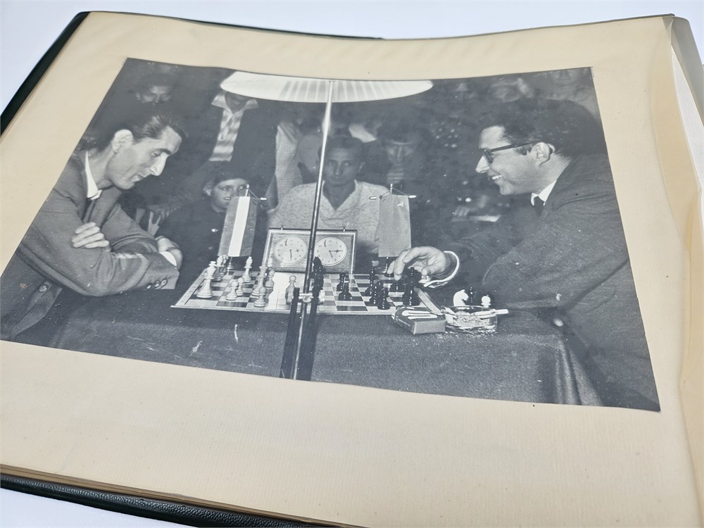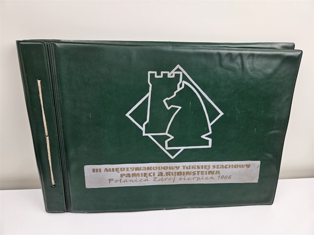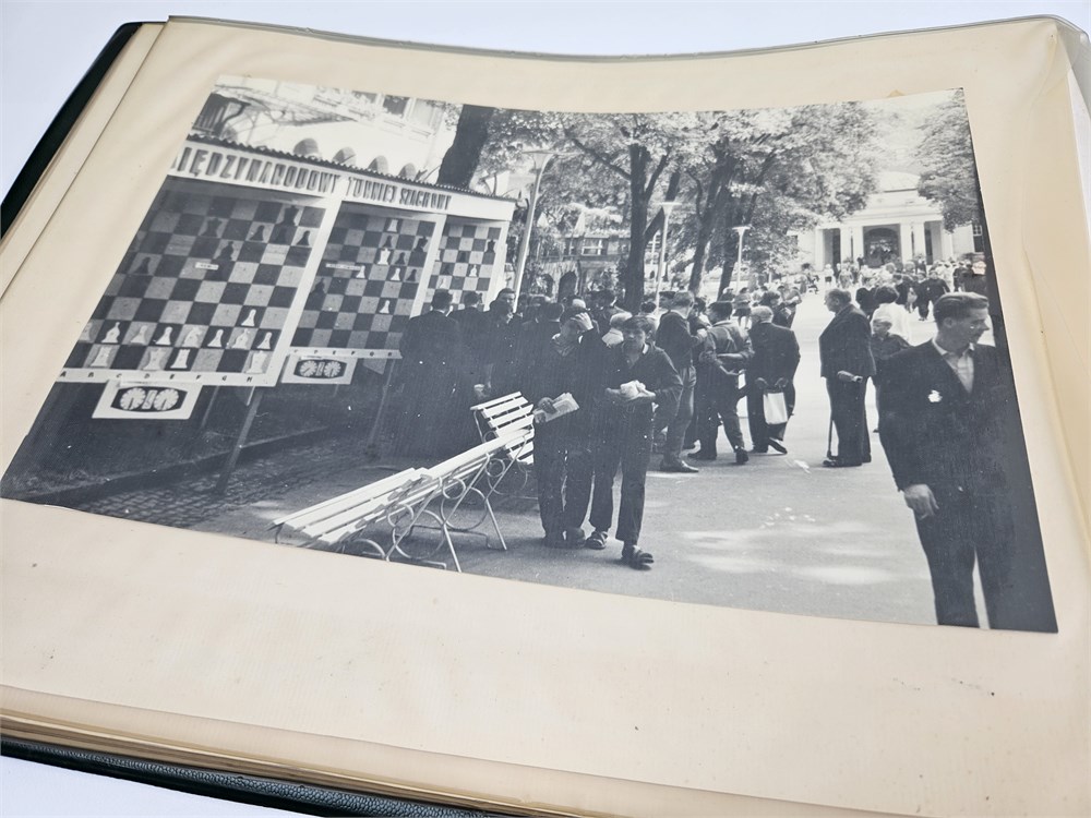 Photo album of the III International Rubenstein Memory Chess Tournament in Polanica Zdroj, August 1965. 19 Photos, size 24 x 30 cm, and a score table. The soft plastic is yellowed, but it did not damage the photos.