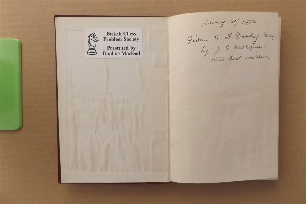 Heathcote (G.): Chess Idylls. A Collection of Problems by Godfrey Heathcote. Edited by M.Marble, A.C.White & G.Hume. Stroud, 1918. Original dark red cloth, VG. 299pp. 300 problems, lengthy introduction, notes and prize list. Without Christmas slip. With a label of the BCPS to endpaper and a gift inscription. Christmas Series No.24.